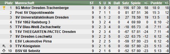 In der Saison 2009/2010 spielte unsere 1. Mannschaft in der 2. Bezirksliga Staffel 1 im Bezirksverband Dresden, wurde am Ende Platz 6 von 10 und war somit noch im Mittelfeld dabei